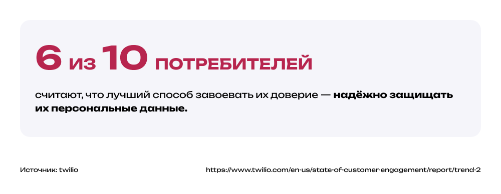 Репутационные потери. Очевидный риск – потеря доверия партнеров и клиентов. Все больше людей начинает задумываться о том, как компании используют их данные, как долго их хранят и насколько надежно защищают. Недавнее исследование Twilio показало, что потребители называют качественную защиту своих данных самым надежным способом завоевать их доверие.