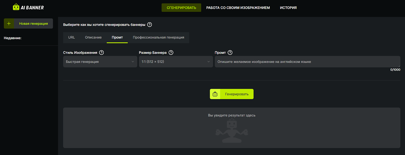 Генерация изображений. Создание логотипов, баннеров, обложек и других креативов по промпту, описанию или ссылке на сайт. Можно выбрать размер от 512×512 до 1024×1024 и режим работы (анимация, идеальный, быстрый, фотореалистичный и другие).