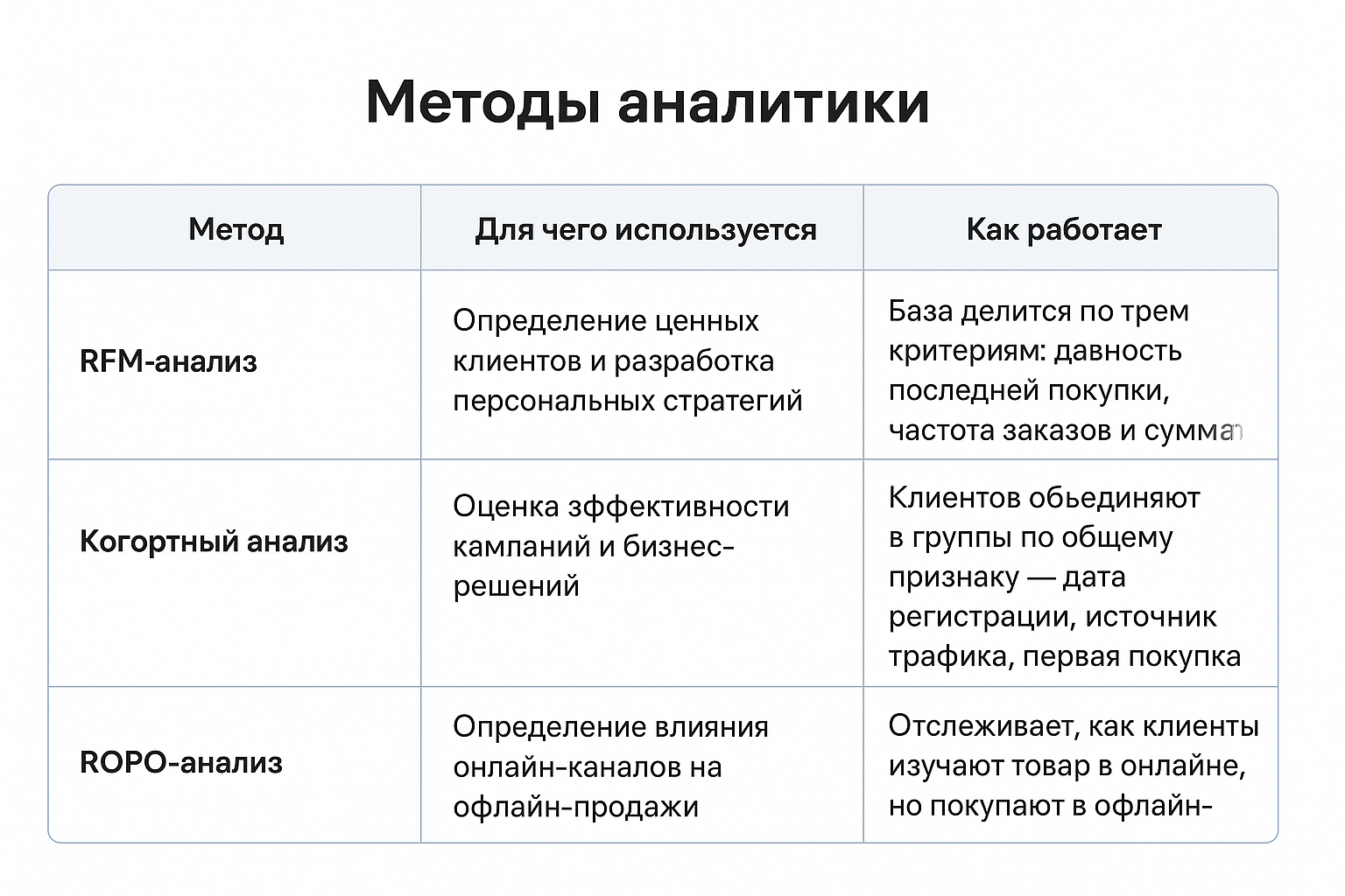 ROPO-анализ. Помогает увидеть, как онлайн-каналы приводят покупателей в офлайн-магазины. Человек может изучать отзывы, сравнивать цены на сайте или смотреть товар в рассылке, но покупку совершит в торговой точке. Без учета этого эффекта маркетолог видит искаженную картину: кампания вроде бы «не работает», а на самом деле именно она приводит клиента в магазин.