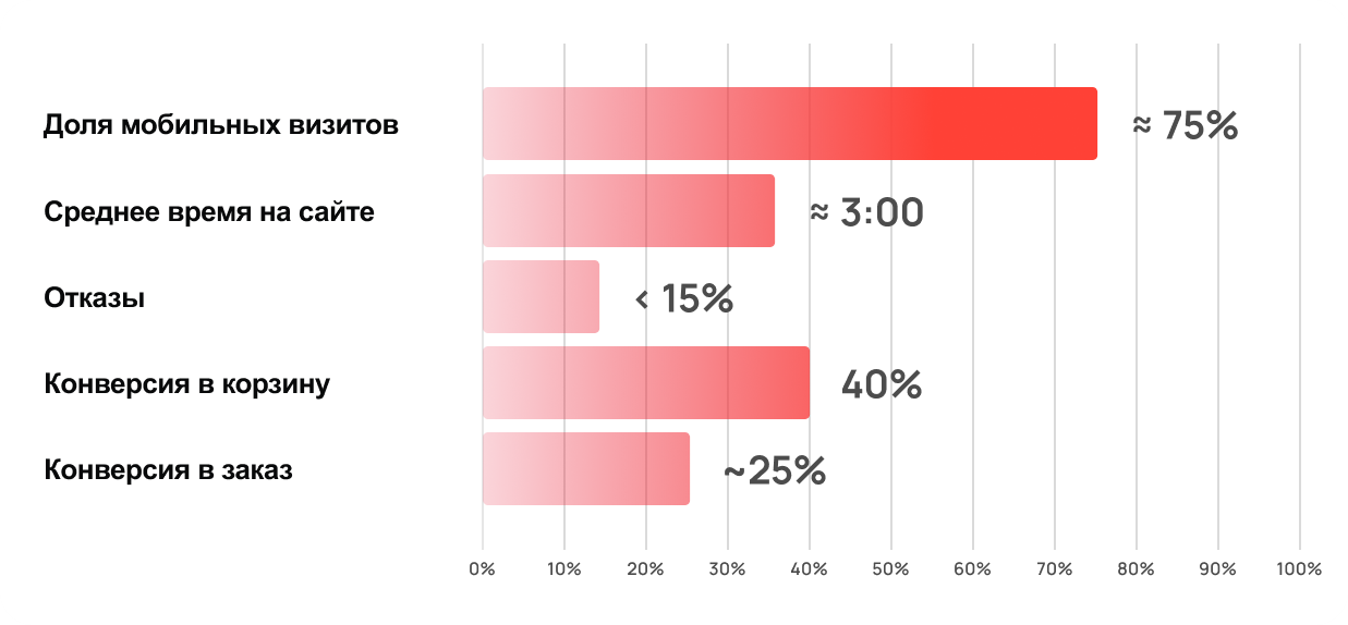 Результат: доля мобильных пользователей выросла до 75% при сохранении нормальных поведенческих показателей (время ~3 мин., отказы < 15%). Конверсия в корзину > 40%, в покупку ~25%.