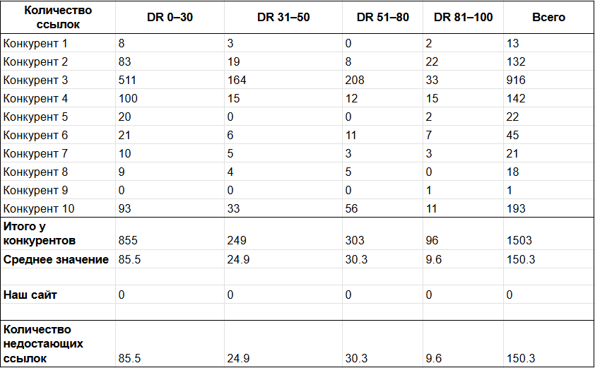 Итогом анализа может стать подобная таблица с распределением ссылок конкурентов в зависимости от Domain Rating (DR) доноров:
