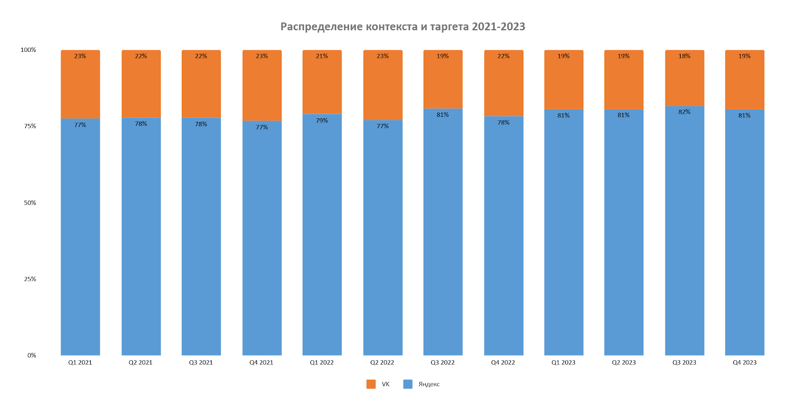 Ниже распределение объема рекламы между таргетом и контекстом. Яндекс уверенно сохраняет лидерство.