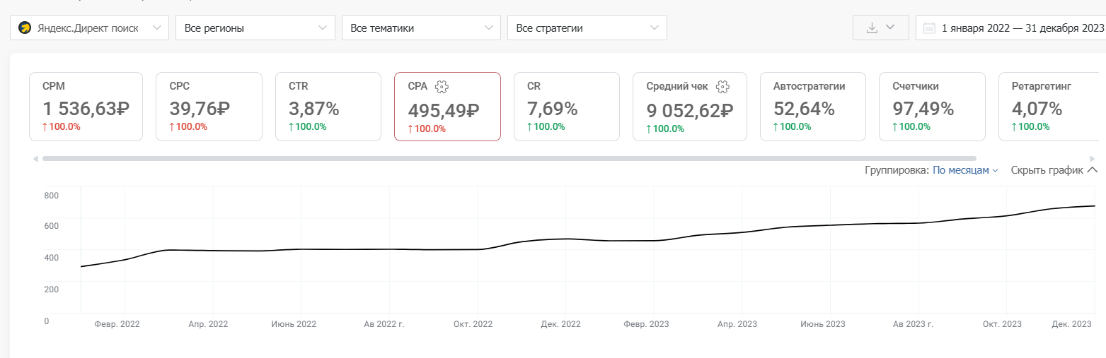 По данным «Пульса click.ru» на фоне изменения оборотов рекламных площадок средняя стоимость лида (CPA) в отечественных рекламных системах (Яндекс, VK, myTarget, Авито) за период 2022-2023 г. выросла на 100%.